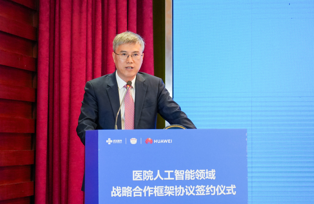 陶晓东在讲话中回顾了讯飞医疗与华西医院、华为的合作渊源。一方面,讯飞医疗智慧医院解决方案包括智能导医导诊系统、互联网医院病史采集系统、智能随访系统等已在华西医院得到了应用,提升了医护人员的工作效率,优化了患者的就医体验;另一方面,讯飞与华为共同推出了软硬件一体化的智能医疗助手,已在华西医院上线并将进行模型训练。他表示,此次三方合作是天时、地利、人和,是水到渠成。